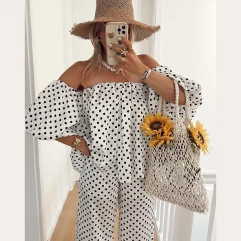 Casual Polka Dot Pant Outfits Women Elegant Half Sleeve Pleated Off Shoulder Strapless Top Suits 2025 Lady Walk Street Wear New ₹4,110 – ₹4,528Price range: ₹4,110 through ₹4,528
