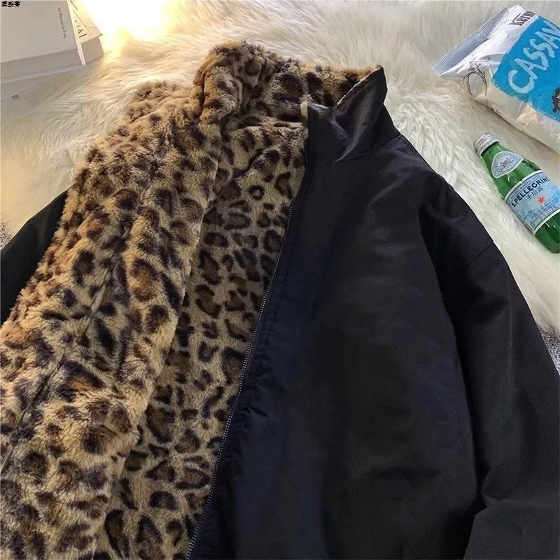 American retro double-sided leopard print cotton jacket vintage warm coat thick lambskin cotton jackets for women winter clothes