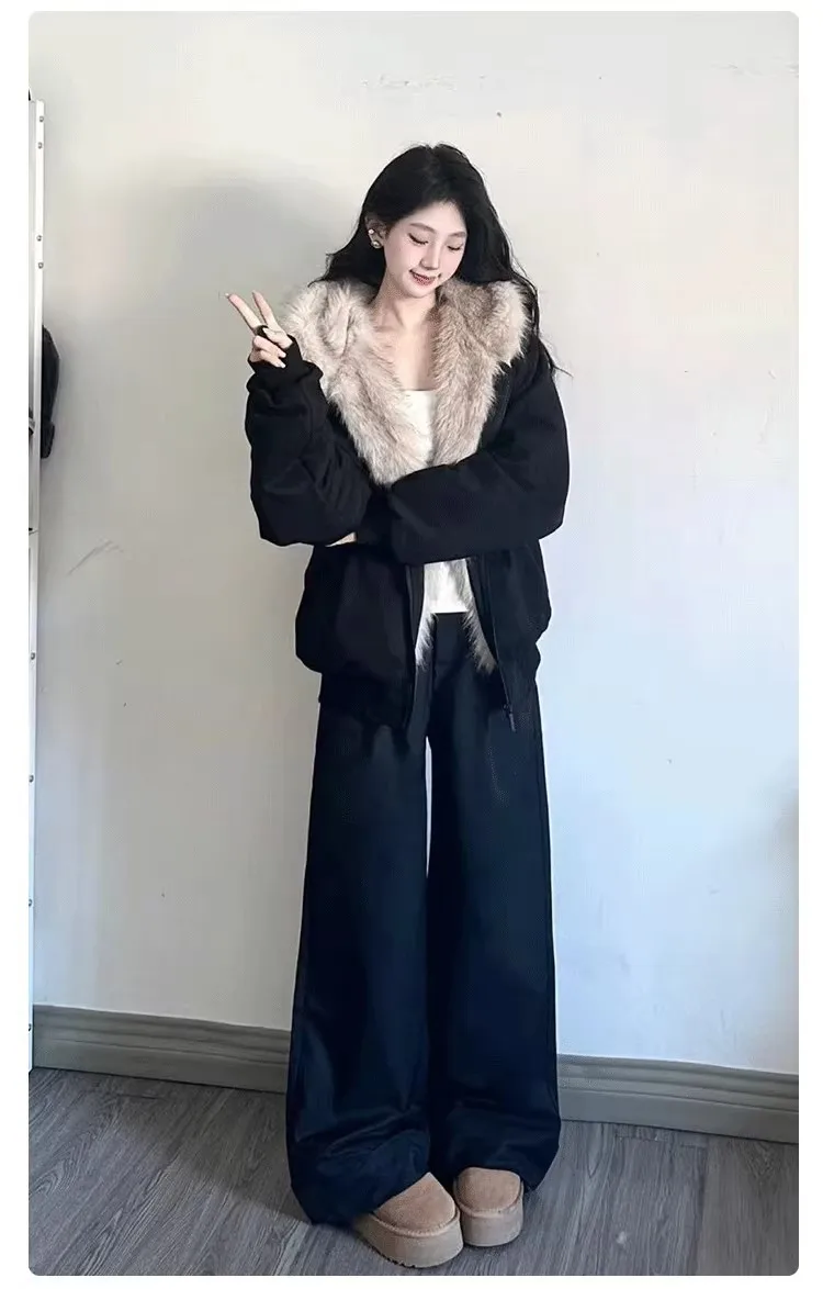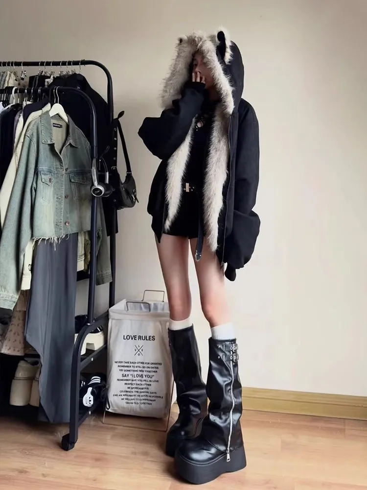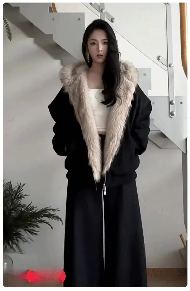 American Retro Fur Collar Hooded Jacket Women Y2K Streetwear Winter New Velvet Thickened Warm Harajuku Loose Casual Jacket