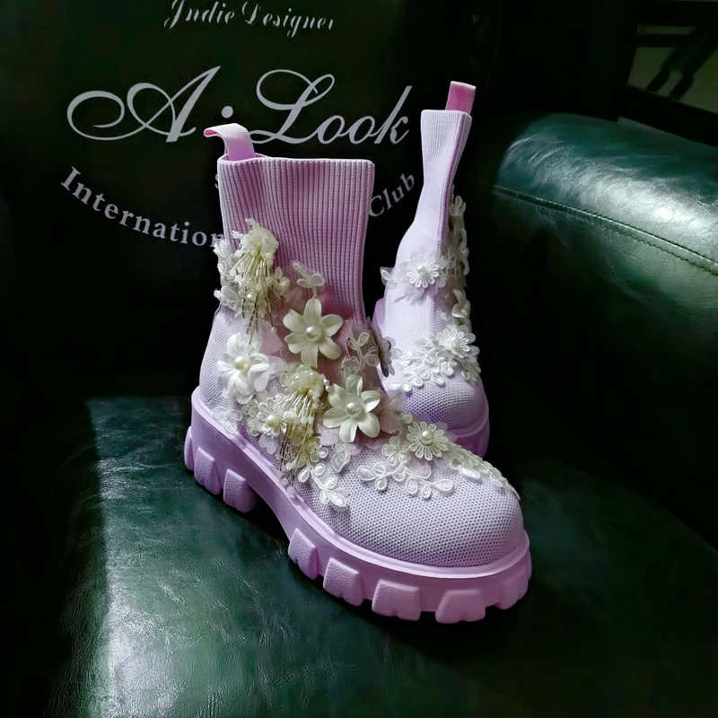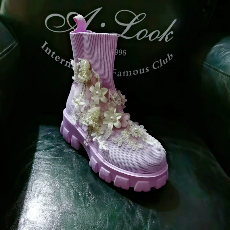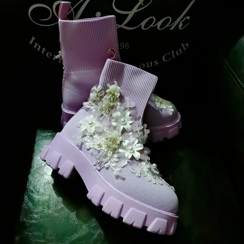 Fashion Round Toe Mid-calf Ladies Modern Stretch Boots Outdoor Female Casual Thick Soled Shoes Women Purple Handmade Lace Boots