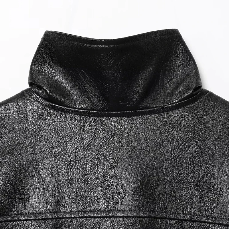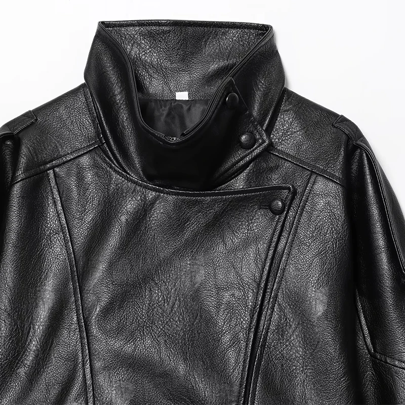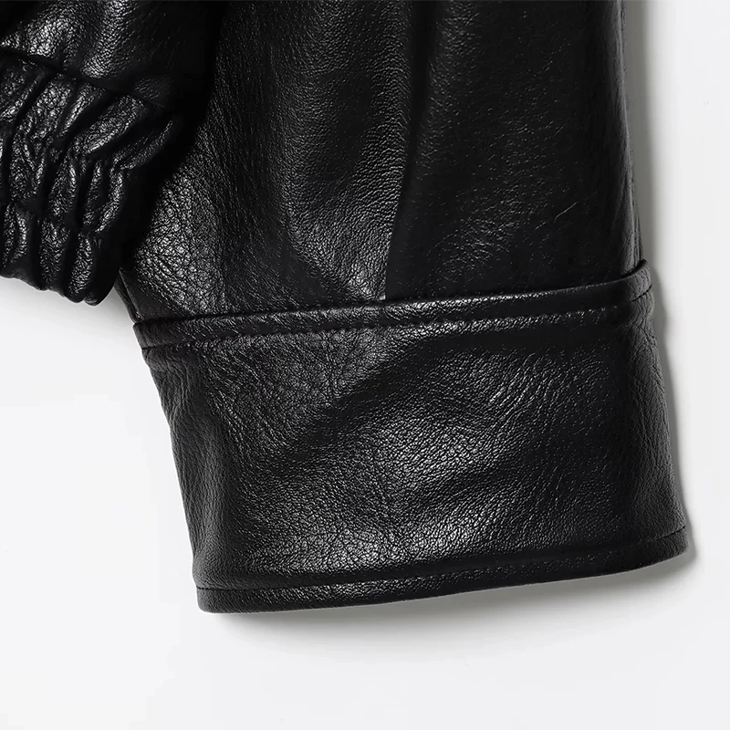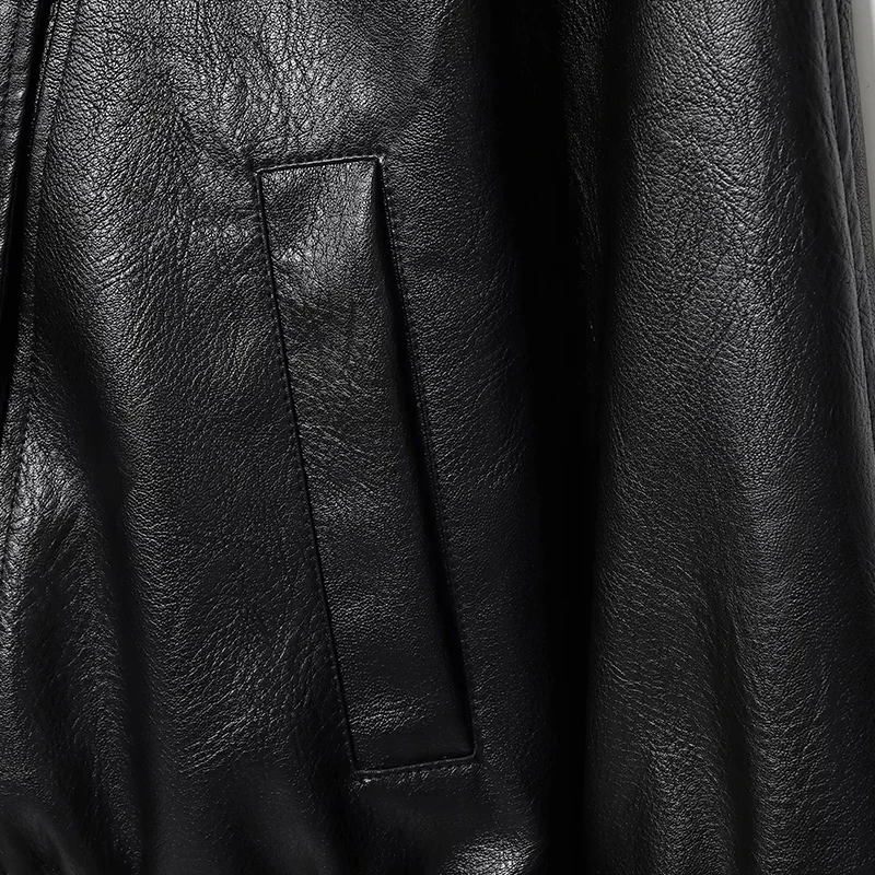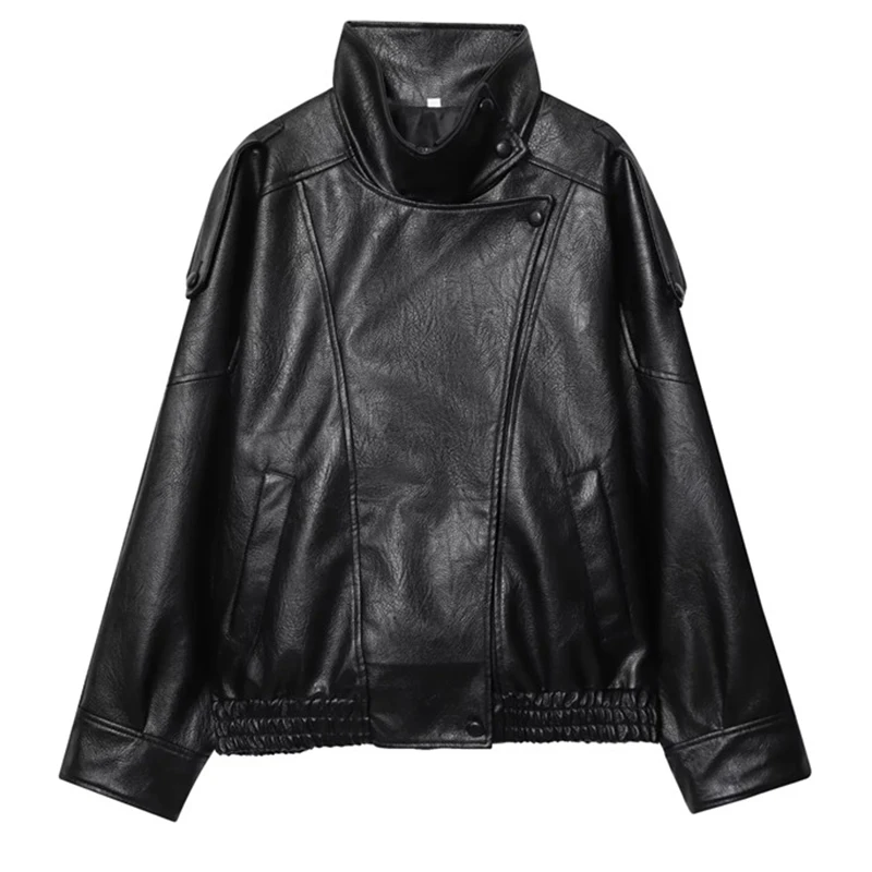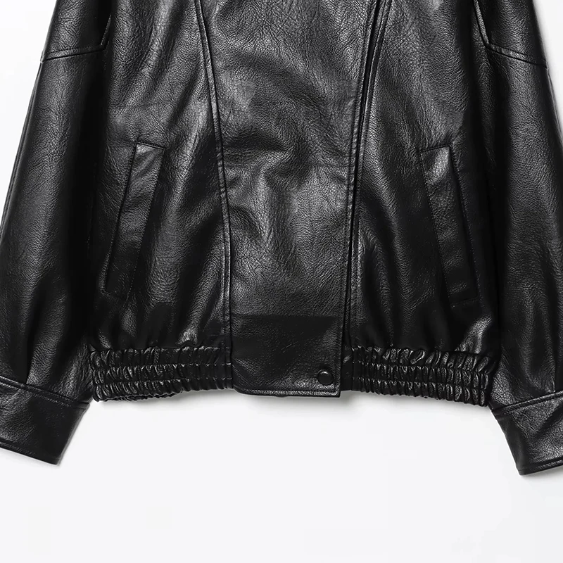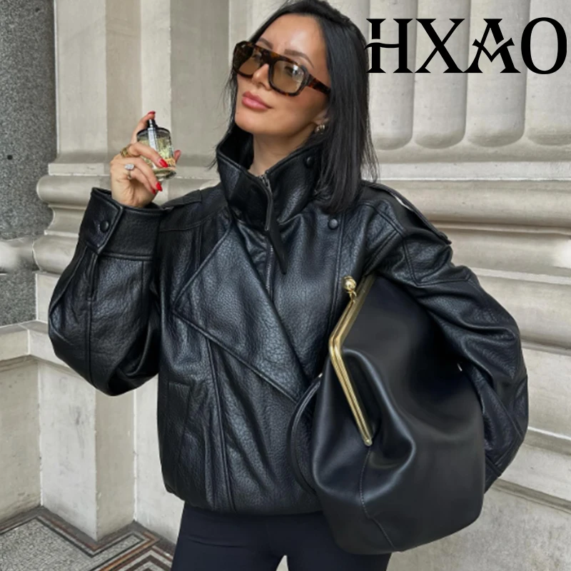 HXAO Faux Leather Jacket Coat Demi-Season Black Bomber Jacket Outerwears Long Sleeve Snap Button Cropped Motorcycle Jacket