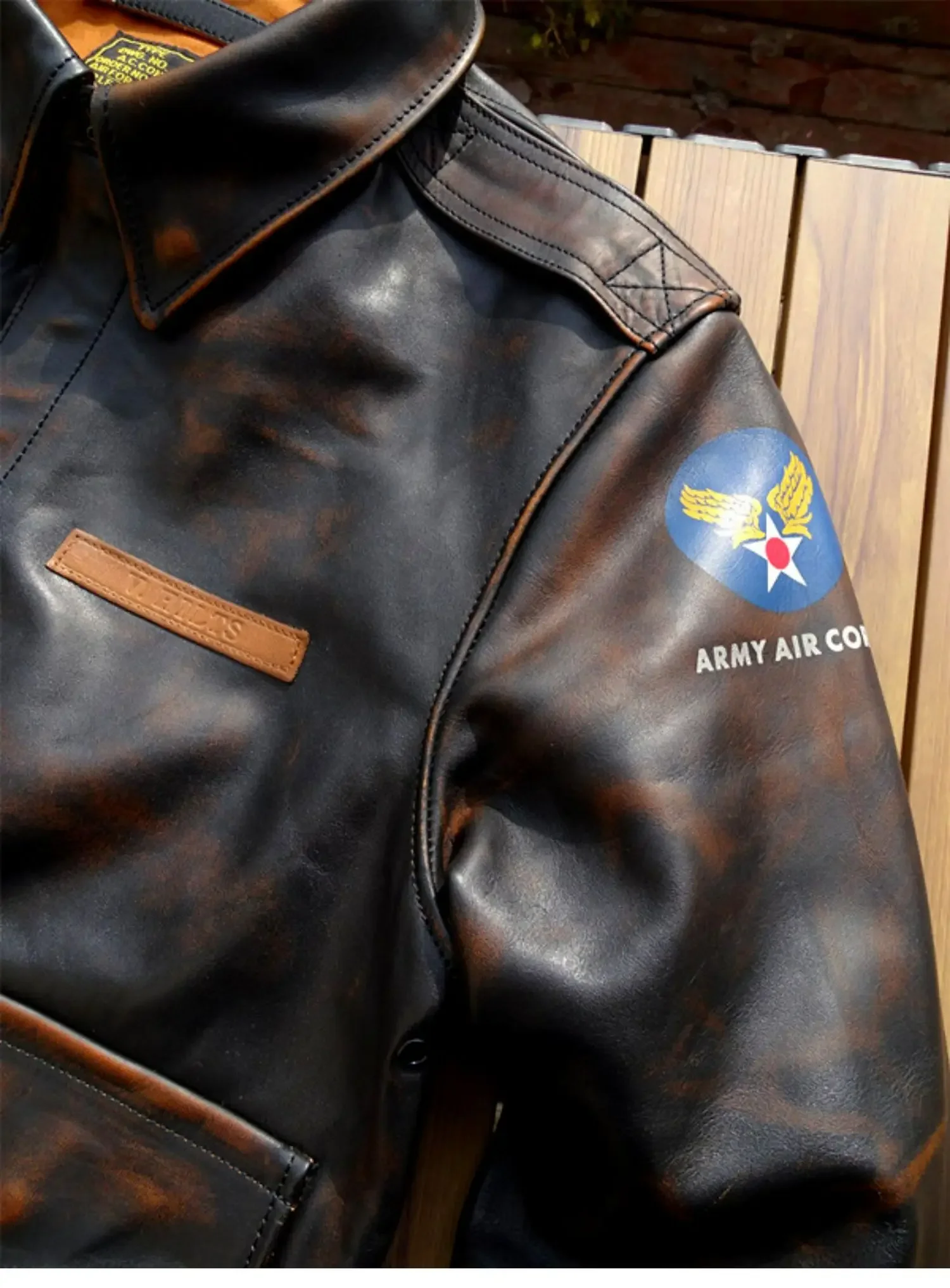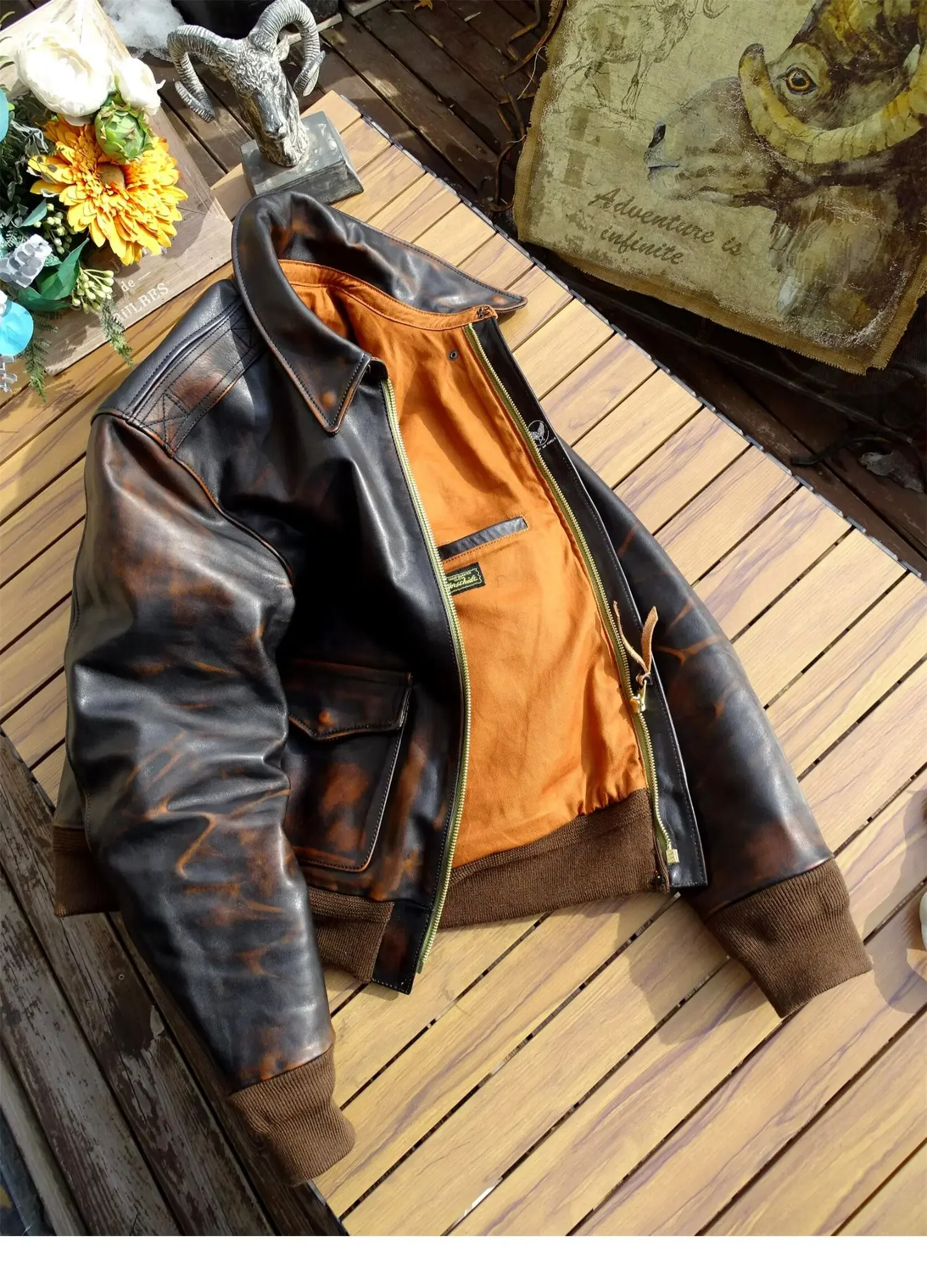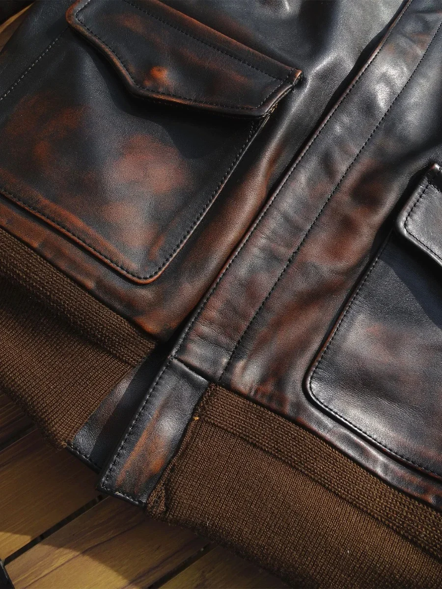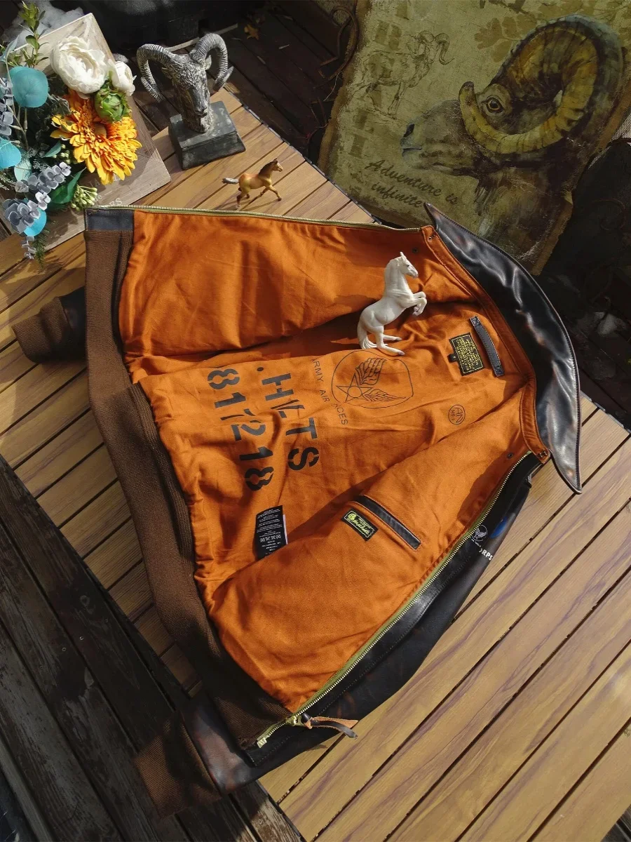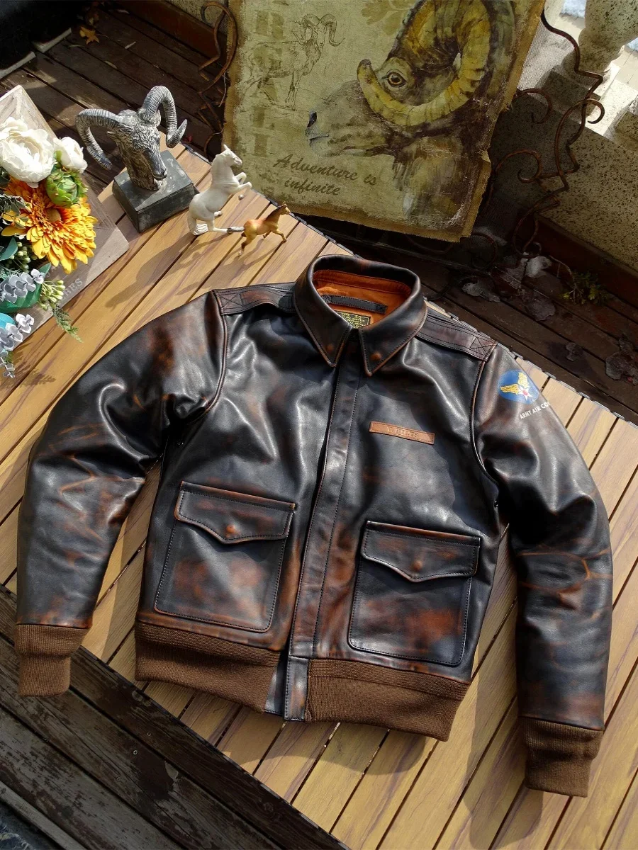 Men’s Distressed A2 Bomber Genuine Leather Jacket for Men Tea Core Horsehide Coat Military Style