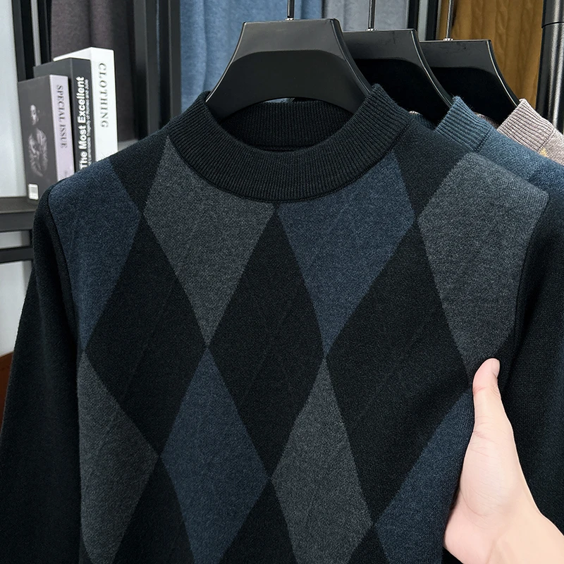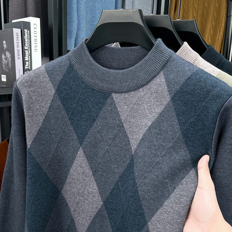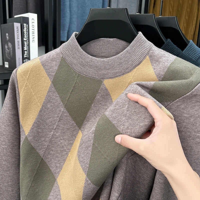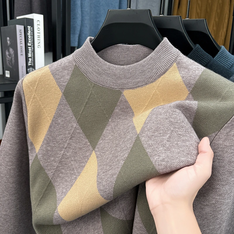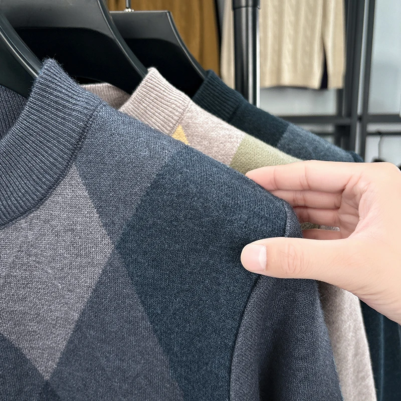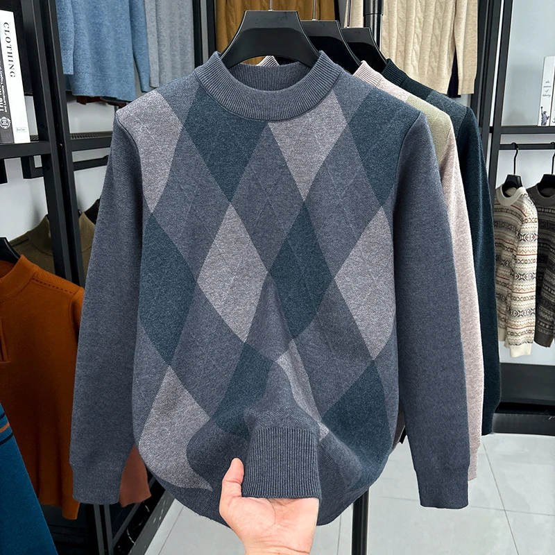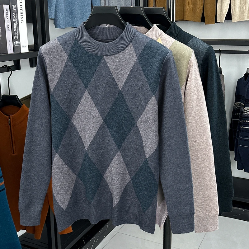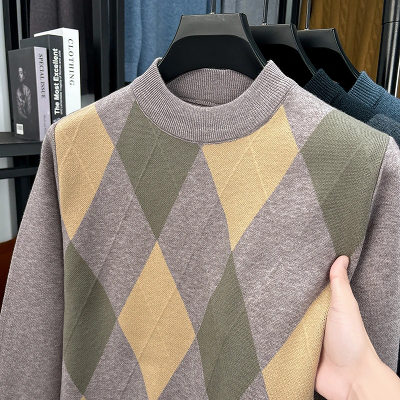 Winter Warm New Men’s Plaid Half High Collar Long Sleeve Sweater Knitted Sweater Fashion Casual Versatile Top