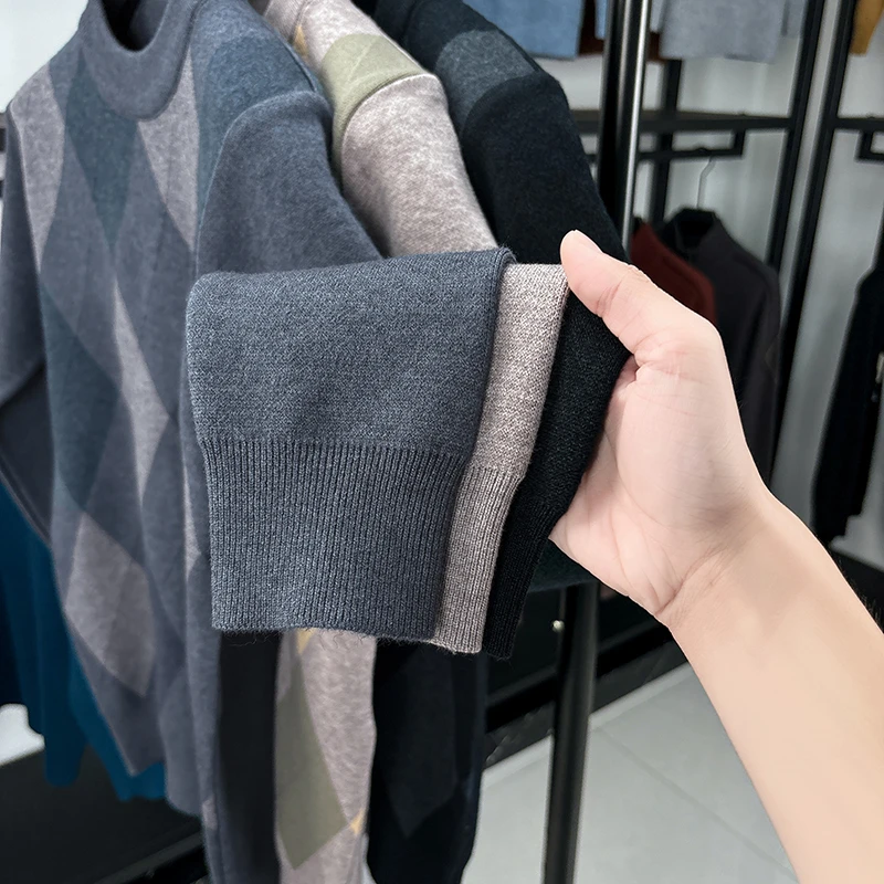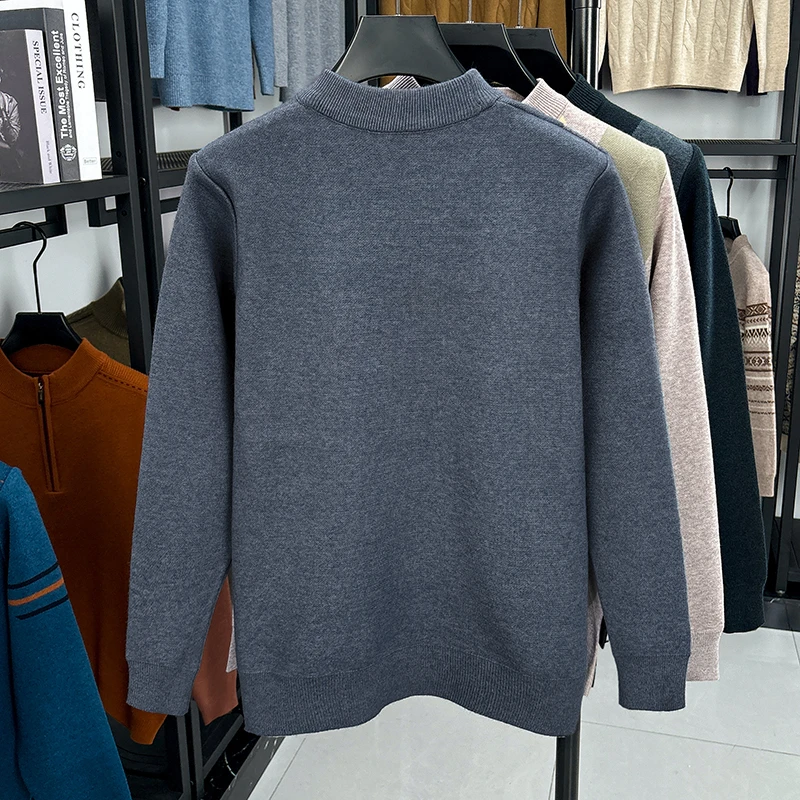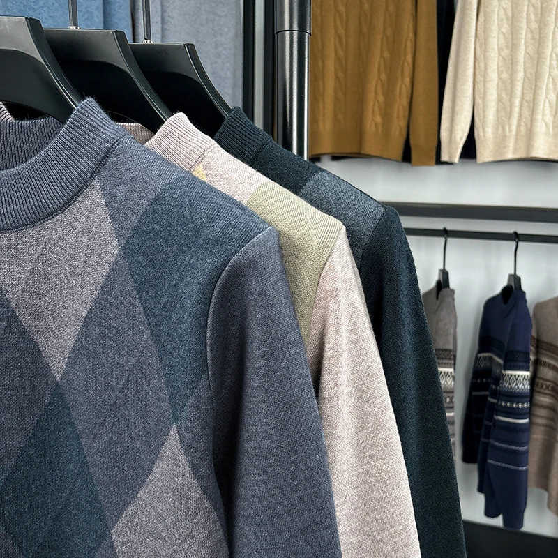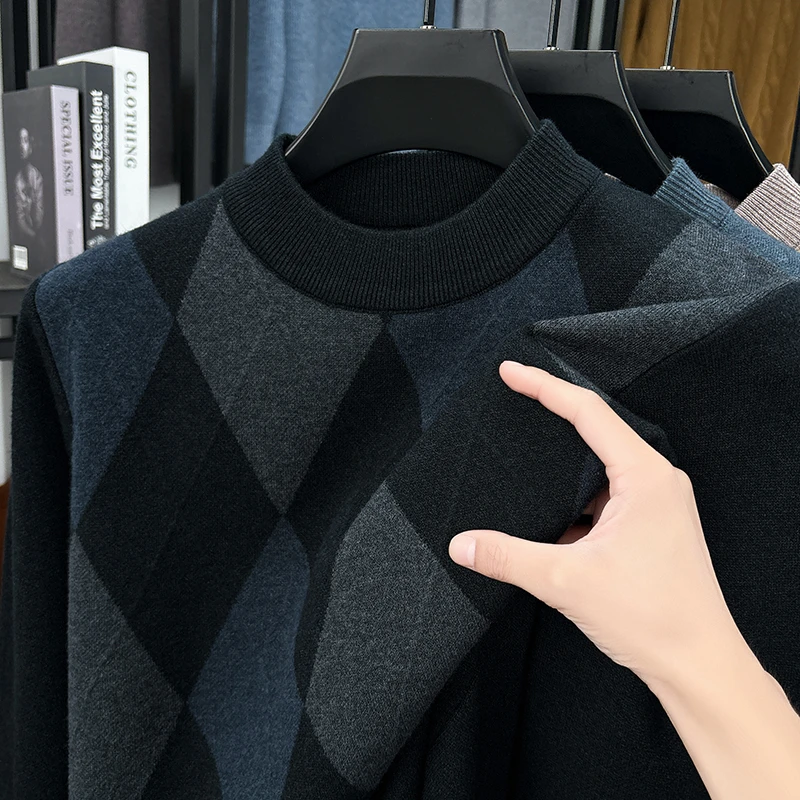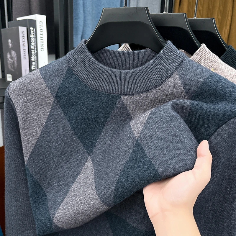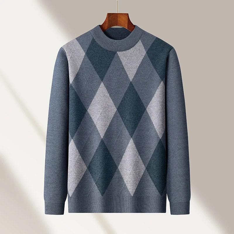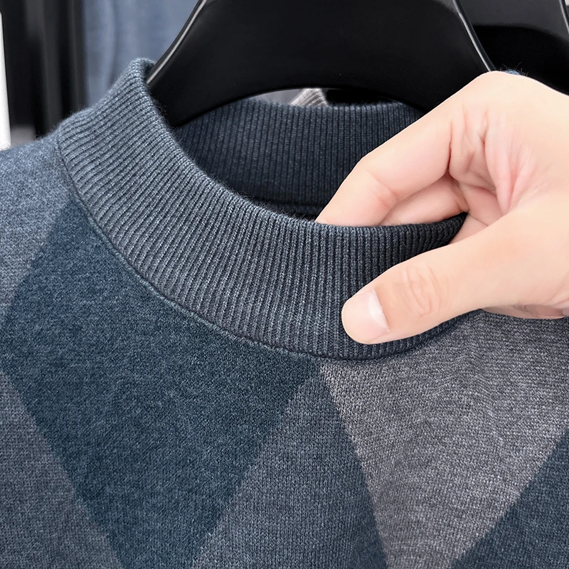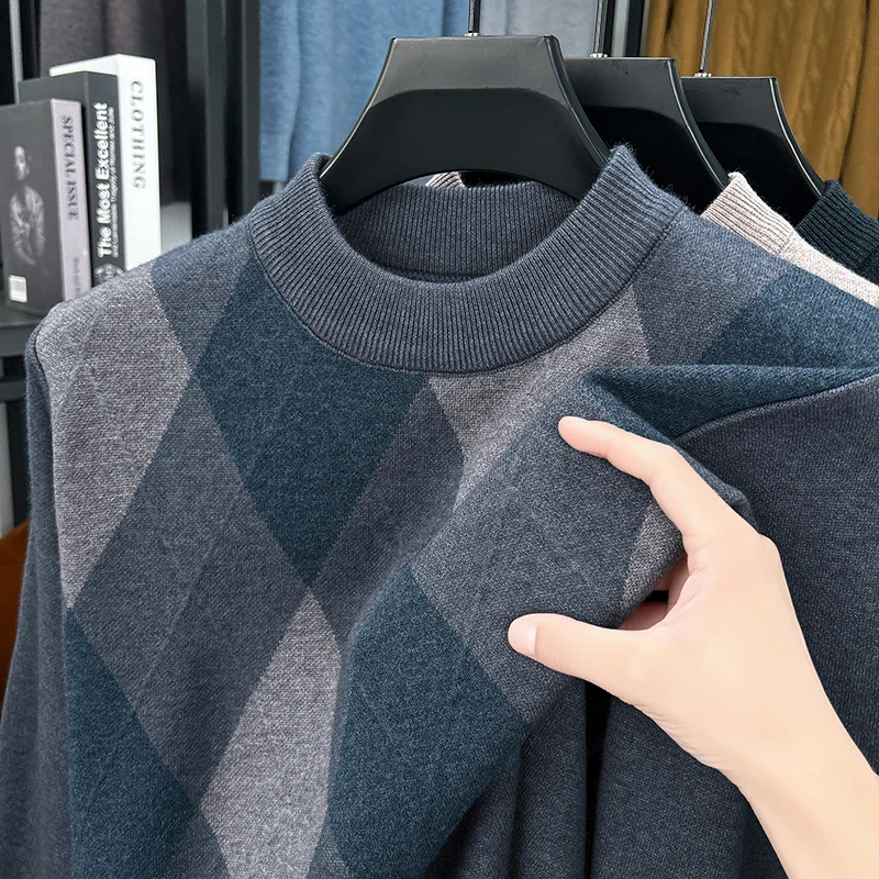 Winter Warm New Men’s Plaid Half High Collar Long Sleeve Sweater Knitted Sweater Fashion Casual Versatile Top