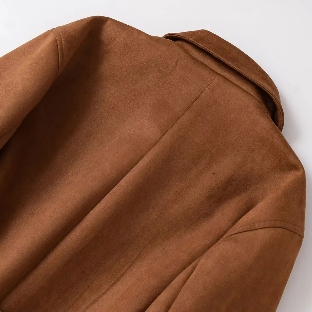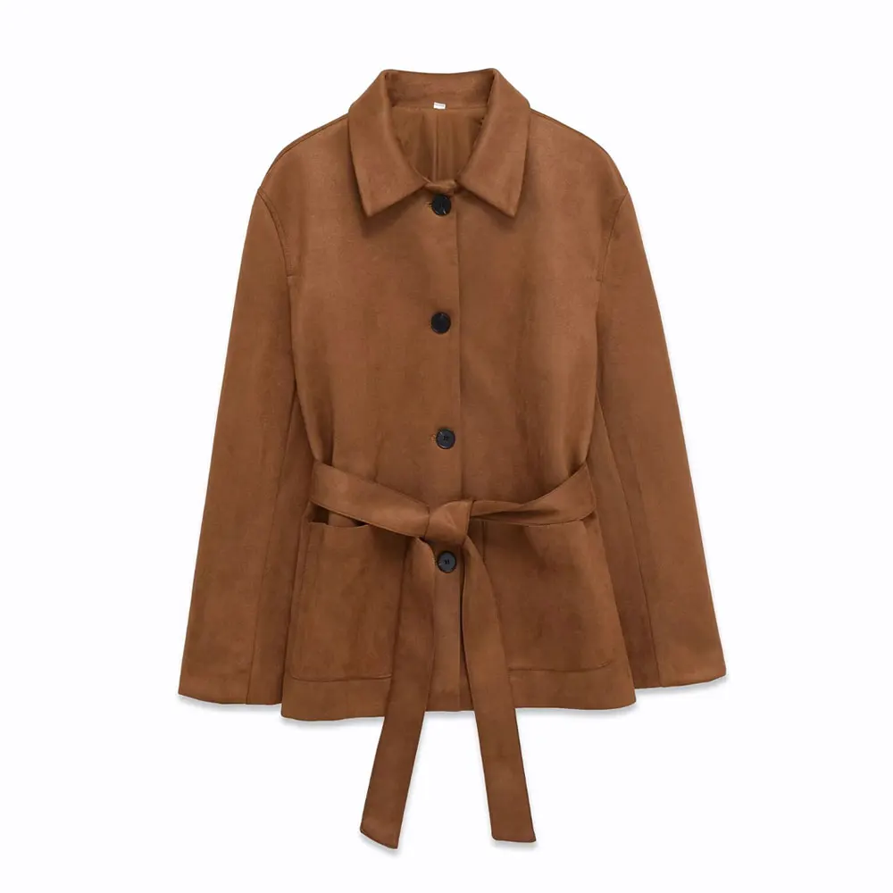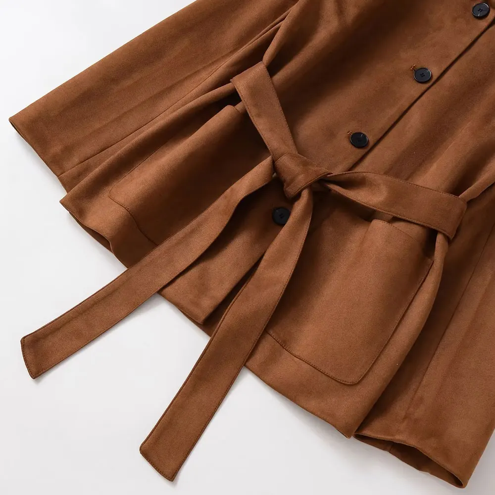 Women’s Faux Suede Jacket Coat with Belt Long Sleeve Front Pocket Chic Outerwear Female Tops